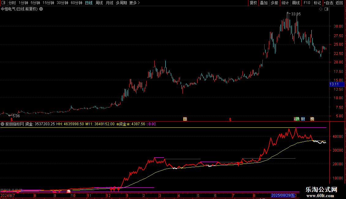 前期高点:=REF(资金,BARSLAST(DD1)),COLORFF00FF,NODRAW;