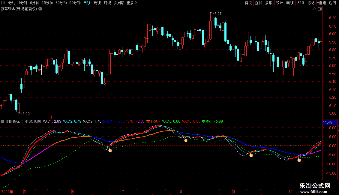 2 副图中手势图标即为买点信号 信号同步一致 建议选择波动幅度较大 股性相对活跃个股参与.