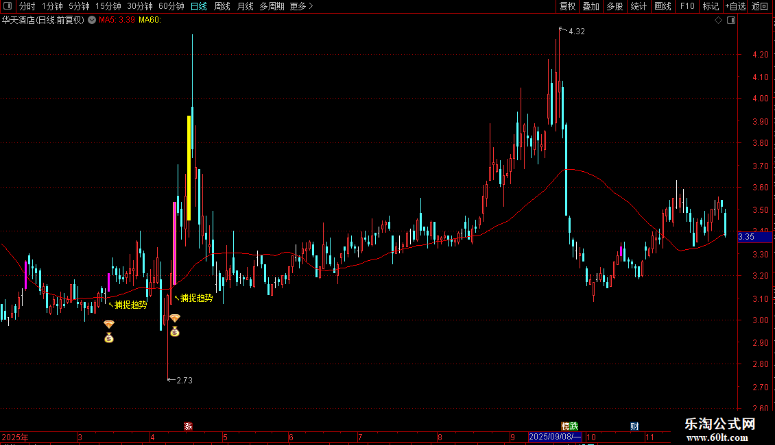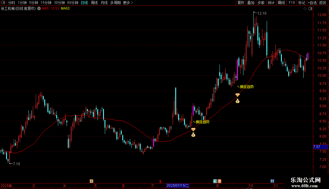 DRAWTEXT(VAR1 AND 捕捉线>REF(捕捉线,1) AND C>捕捉线,L*0.98,'↖捕捉趋势'),COLORYELLOW;