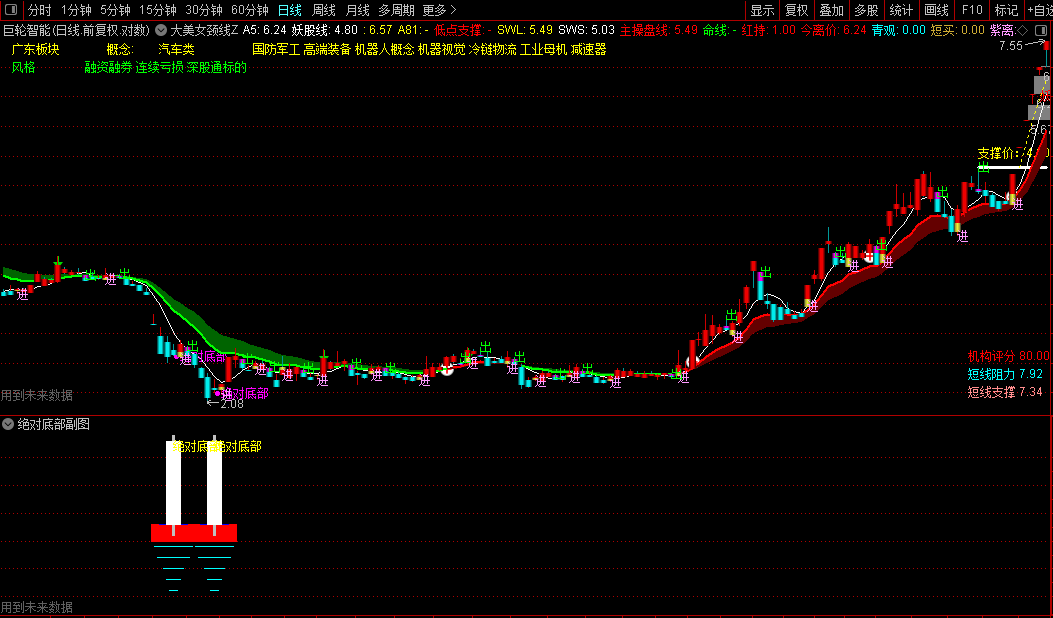 本指标为“大美女颈线突破”包括1主、2副和2选指标分析工具,主要用于识别个股关键颈线位置的突破信号,并辅助判断买卖时机。其核心功能包括:自动绘制不同周期的颈线及支撑压力线,当价格放量突破白色“妖股线”或黄色颈线时,会标记“妖股”或“突破颈线”提示,为趋势启动提供参考。同时,指标结合成交量、跌幅等条件,在特定回调位置捕捉“凹口淘金”等低吸机会,并设有“绝对底部”、“全军出击”等多元买点预警。此外,它还整合了短线支撑阻力位显示、机构评分、涨停统计等实用信息,帮助投资者综合把握股价强弱与结构,适用于趋势跟踪和突破交易的辅助决策。
