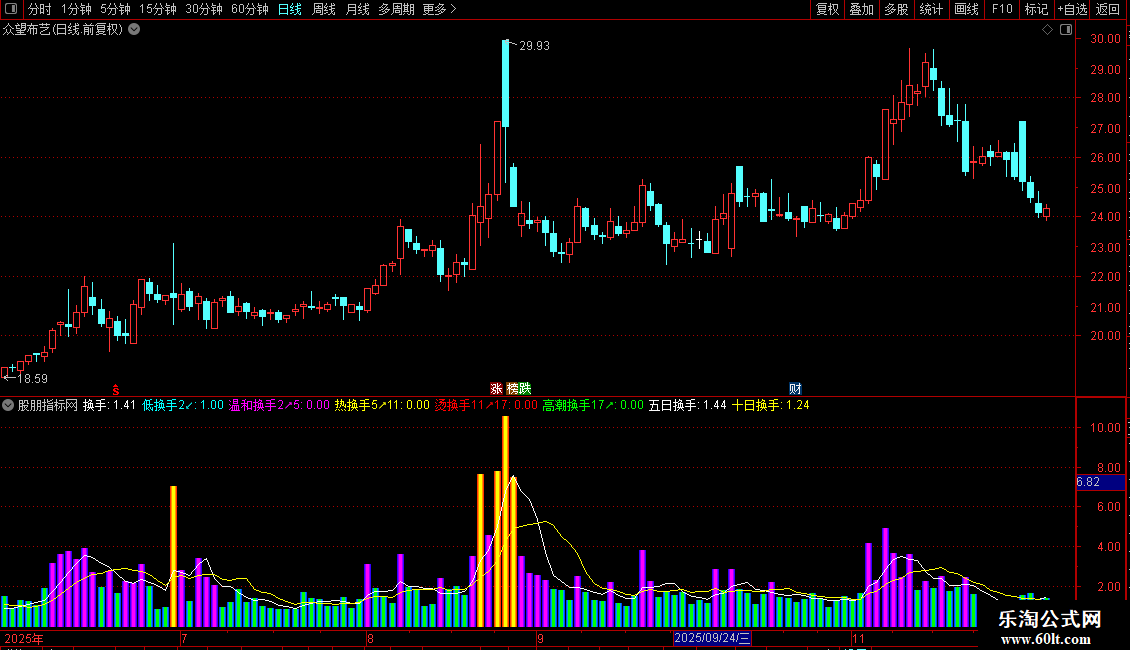 STICKLINE(换手>2 AND 换手<5,0,换手,0.3,0)COLORFF00FF;