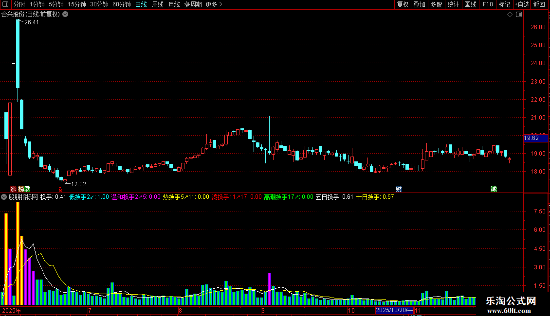 当满足条件换手>17时,在0和换手位置之间画柱状线,宽度为1.3,0不为0则画空心柱.,COLOR00A600