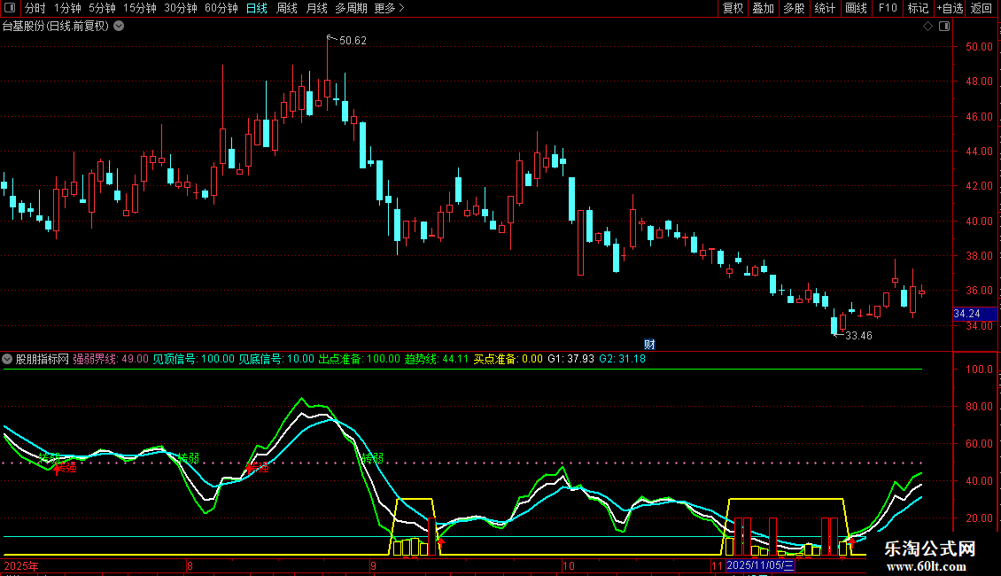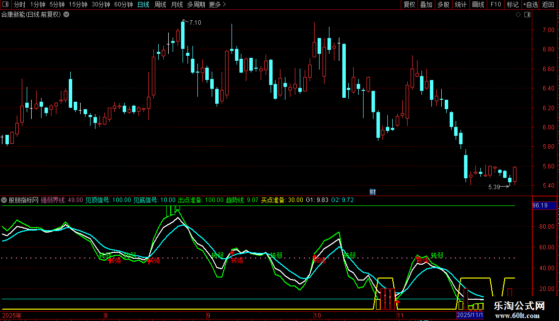 DRAWTEXT(CROSS(49,趋势线),52,'转弱'),COLORGREEN;