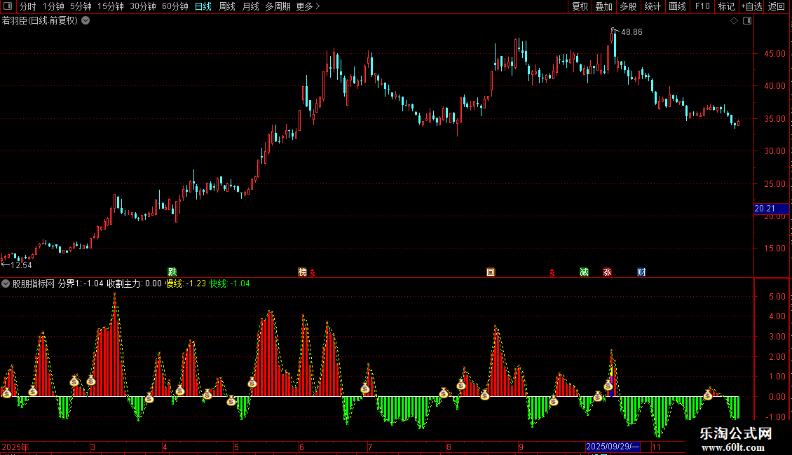 STICKLINE(分界1< 0,分界1,0,2,0),COLORGREEN;