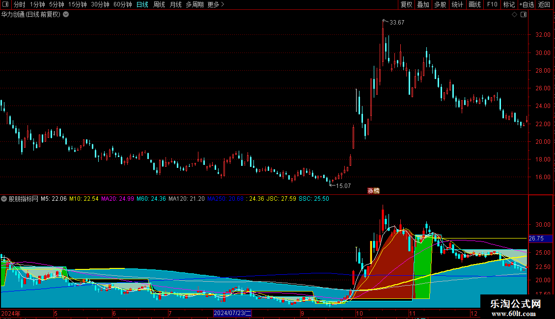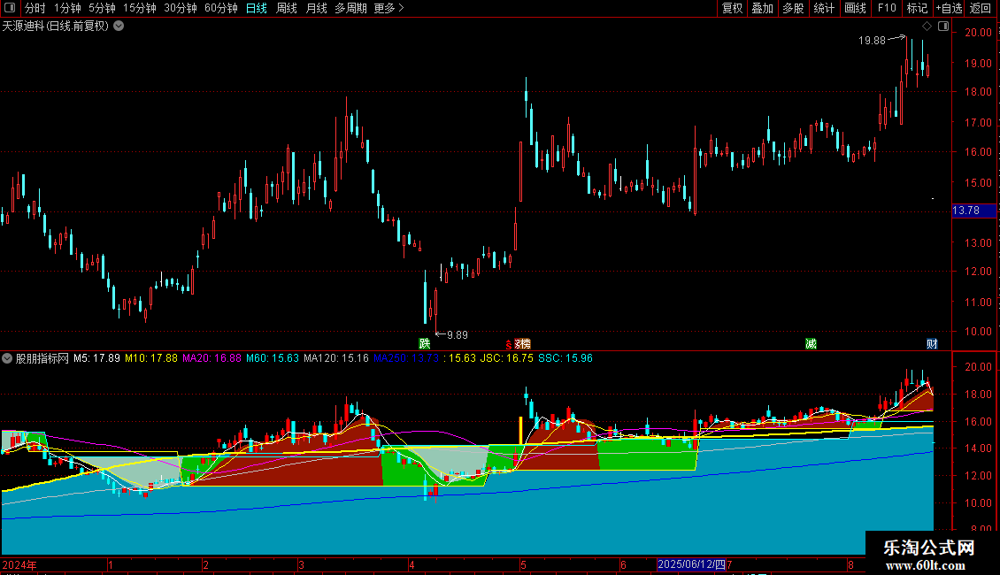 IF(MA60>=REF(MA60,1),MA60,DRAWNULL),COLOR00FFFF,LINETHICK2;