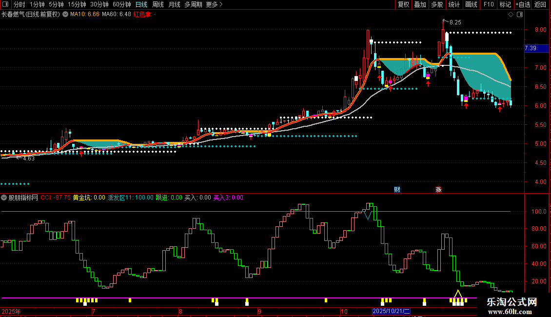黄金坑:IF(短期5日乖离率<-100,10,0),COLORYELLOW,LINETHICK2;