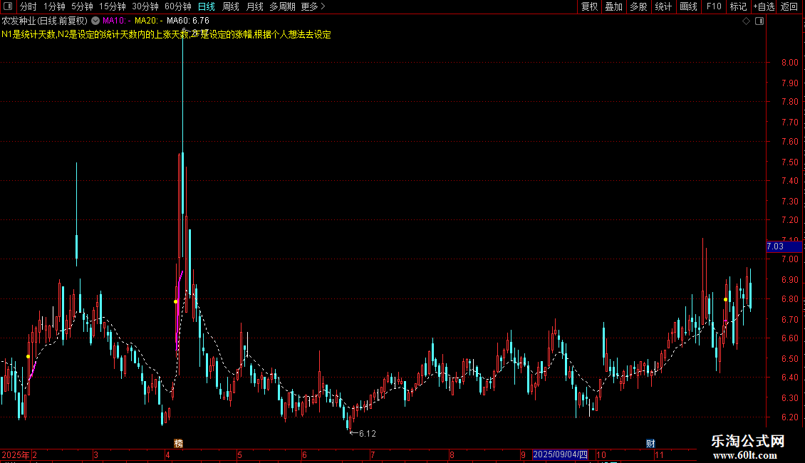 DRAWTEXT_FIX(1,0,0.0 ,0,'N1是统计天数,N2是设定的统计天数内的上涨天数,ZF是设定的涨幅,根据个人想法去设定'),COLORYELLOW;