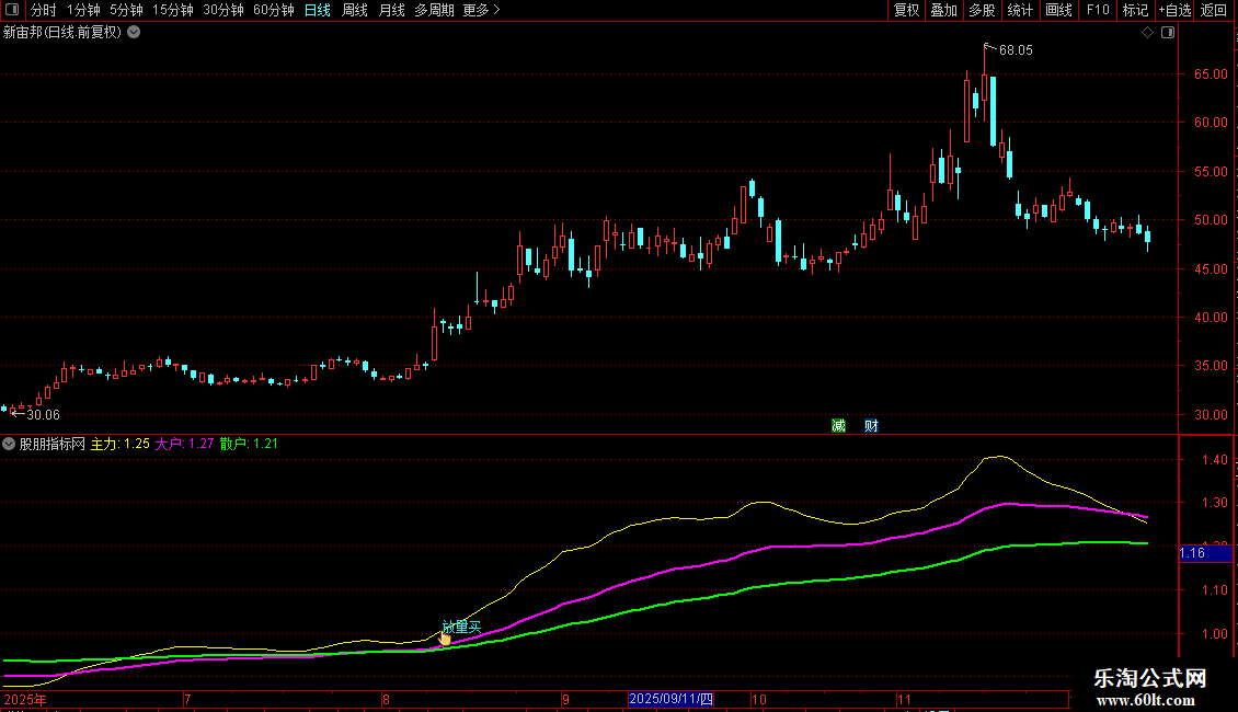 自用指标,不一样的三线定强弱副图,有买点提示,感觉挺精准的!黄线、紫线、绿线从上到下多头排列时关注,出现“放量买”时入手,往往有比较好的收益,甚至可能有惊喜。本指标源码,无未来函数!