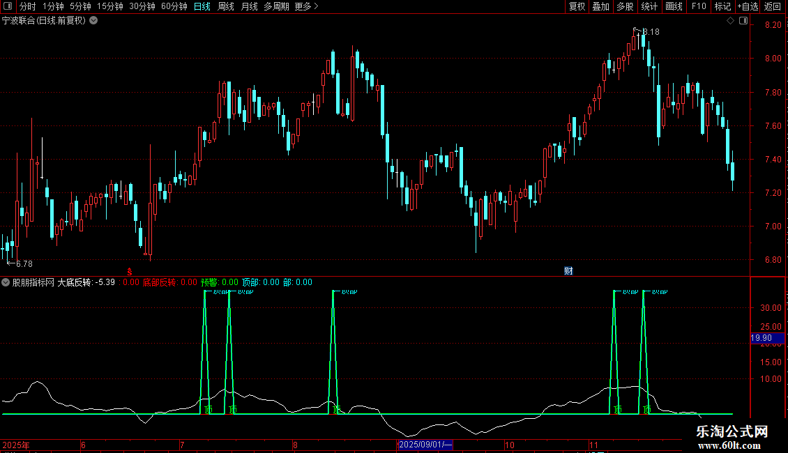 底部反转:CROSS(J,0)&&(VAR5<=(0-7)),COLORRED;
