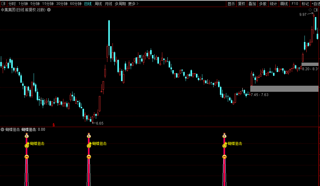 当副图区域出现粉色柱状信号线,并伴有黄色“★蝴蝶狙击”图标及文字标记时,即触发买入信号。该信号通常出现在股价经历短期调整、处于相对低位之际,提示市场短期动能有望转强。