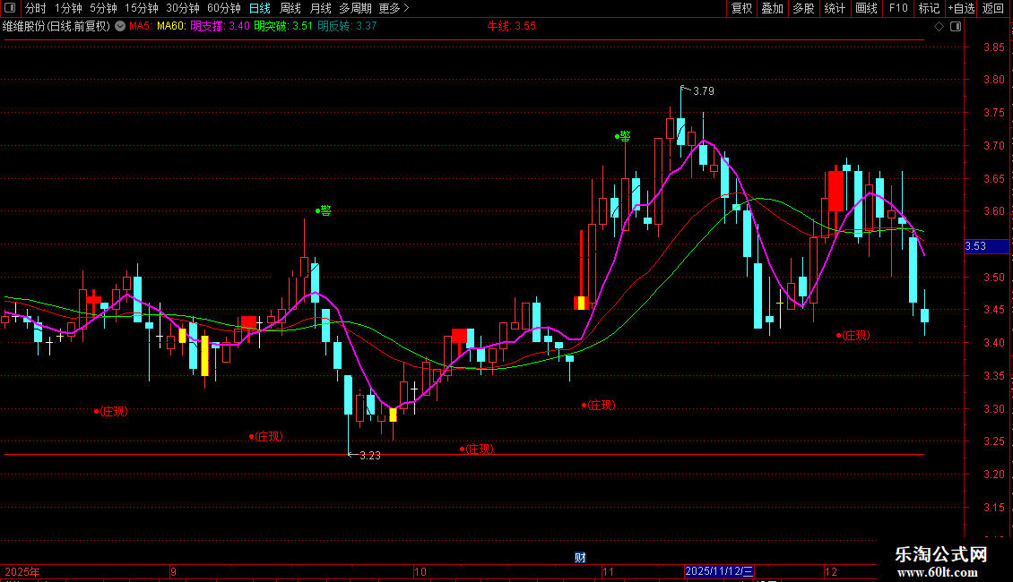 N:=5;E:=(HIGH+LOW+OPEN+2*CLOSE)/5;AAA:=2*E-LOW,NODRAW;AB:=2*E-HIGH,NODRAW;ACC:=E+(HIGH-LOW),NODRAW;ADD:=E-(HIGH-LOW),NODRAW;今阻力:REF(AAA,1),COLORWHITE,NODRAW;今支撑:REF(AB,1),COLORYELLOW,NODRAW;明阻力:AAA,COLORCYAN,NODRAW;明支撑:AB,COLORMAGENTA,NODRAW;明突破:ACC,COLORGREEN,NODRAW;明反转:ADD,COLORLICYAN,NODRAW;{压力+支撑}压力:MA(REF(HHV(C,30),1),2),COLORBLACK;支撑:MA(REF(LLV(C,30),1),2),COLORBLACK;