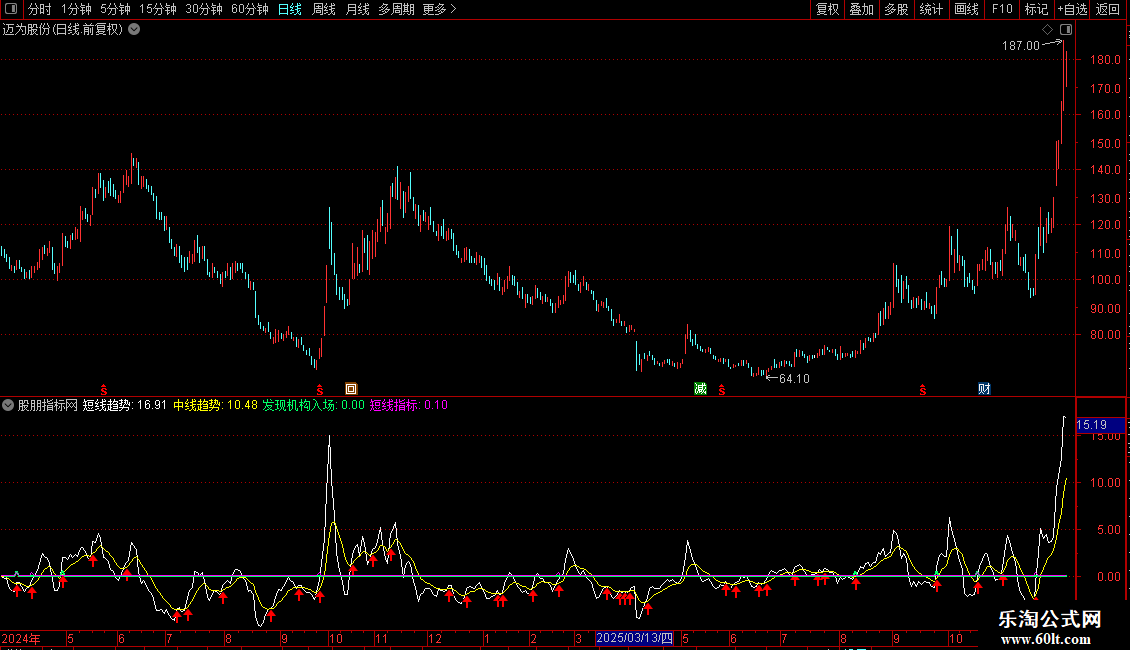 发现机构入场:IF((((((((O <= MA(CLOSE,5)) AND (O <= MA(CLOSE,10))) AND (O <= MA(CLOSE,30))) AND (C >= MA(CLOSE,5))) AND (C >= VARF)) AND ((中线趋势 - REF(中线趋势,1)) > 0)) AND ((短线趋势 - REF(短线趋势,1)) > 0)),0.5,0),LINETHICK2,COLOR66FF00;