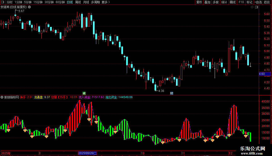 STICKLINE(流入资金>流出资金,流入资金,流出资金,1.6,0),COLORRED;