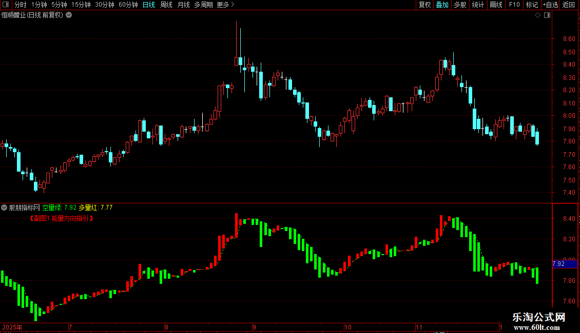 "飞天动能试"是一款通达信副图指标,通过动态能量对比直观显示市场多空动能转换。公式基于三重平滑EMA计算,衍生出"多量红"(多头动能)和"空量绿"(空头动能)两条核心线。当红色柱状线出现(多量红>空量绿),表明买方力量增强,是潜在买入信号;绿色柱状线(空量绿>多量红)则代表卖方占优,提示风险或卖出机会。指标通过颜色变化快速反应趋势强弱,适合短线交易者捕捉转折点。