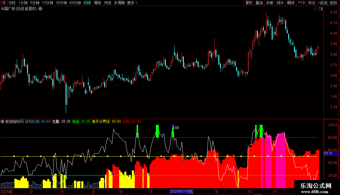 STICKLINE(获利比例>=30 AND 获利比例< 80,0,获利比例,6,0),COLORRED;