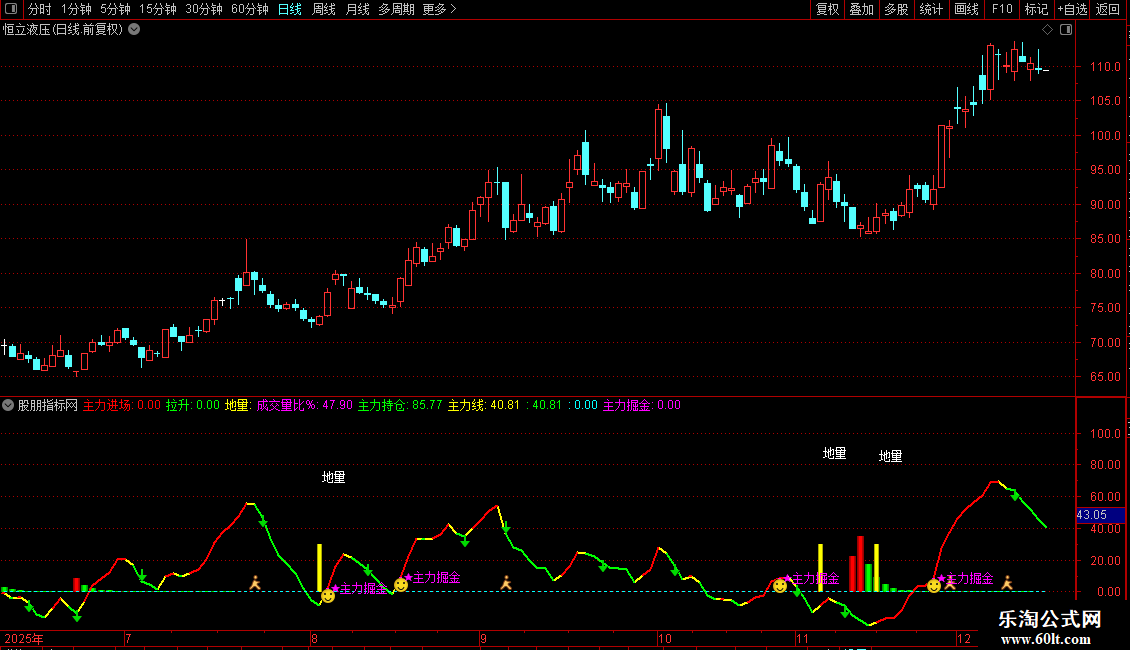 指标通过价格波动、成交量结构与多周期动量,综合判断主力资金是否正在低位吸筹或启动拉升。当股价处于相对低位、出现缩量企稳且主力资金线由负转正并上穿其均线时,系统标记为“主力掘金”信号,提示潜在的启动机会;同时结合地量和超卖状态辅助确认底部区域。操作上可在信号初现时分批布局,配合主力持仓强度和趋势过滤,适合中短线捕捉主力介入初期的个股。