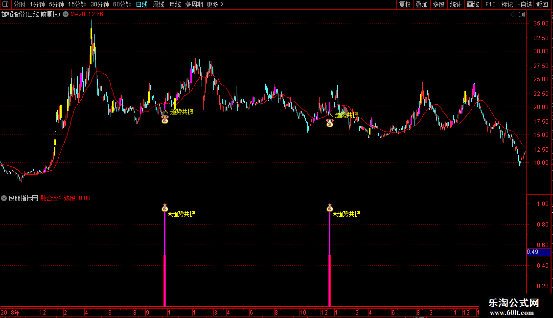 DRAWTEXT(融合金牛选股,0.9, ' ★趋势共振'),COLORYELLOW;<br>