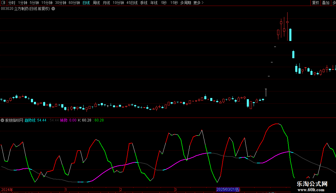 转势:CROSS(趋势线,REF(趋势线,1)),NODRAW,COLORFF00FF;