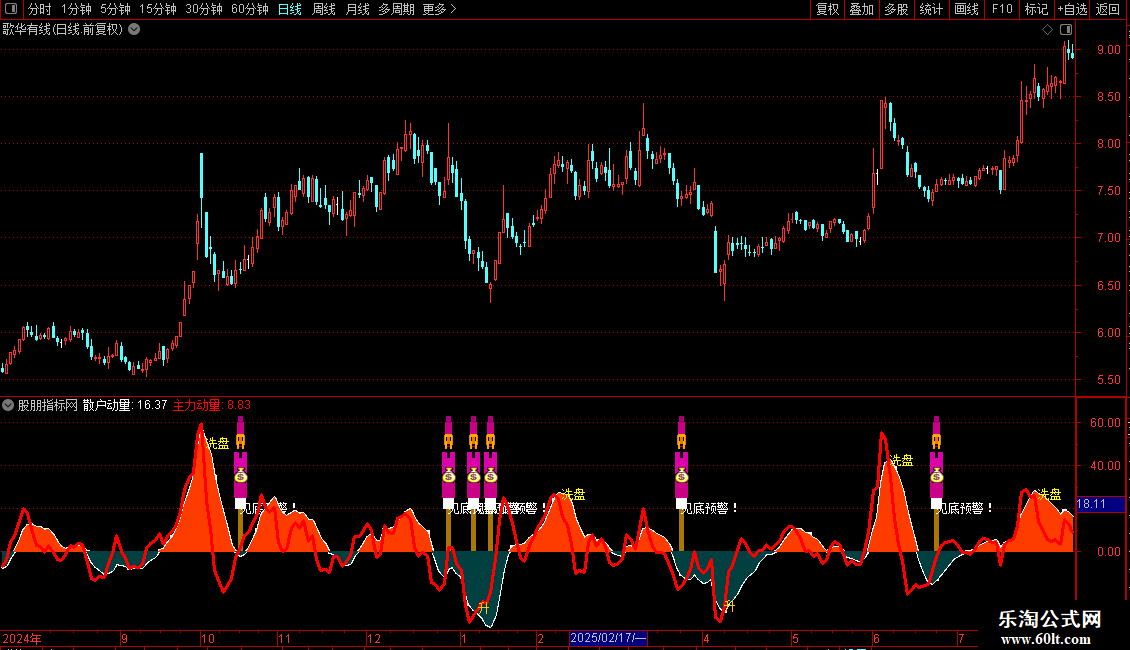 指标融合了随机指标(KDJ)变体、动量对比和相对强弱判断,用于捕捉潜在底部启动机会。通过监测短期价格在近期高低区间中的位置,结合长期与短期均线关系,识别“见底预警”信号。同时,利用散户与主力动量的背离与金叉,判断资金流向变化:当主力动量上穿散户动量且处于低位时,视为上涨启动;若叠加动量回升或极端低位,则触发买入提示。整体策略侧重于在市场情绪低迷、主力悄然介入时提前布局。