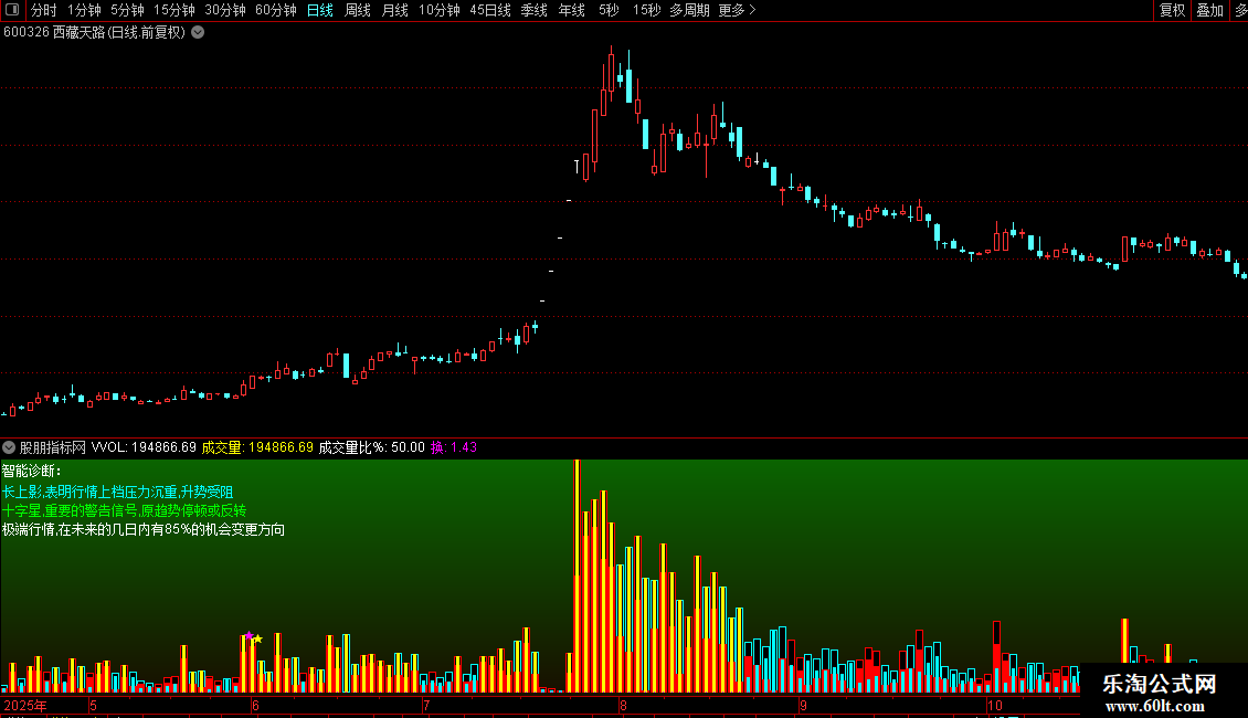 异:=MA(V,135)COLORLIBLUE,LINETHICK2;