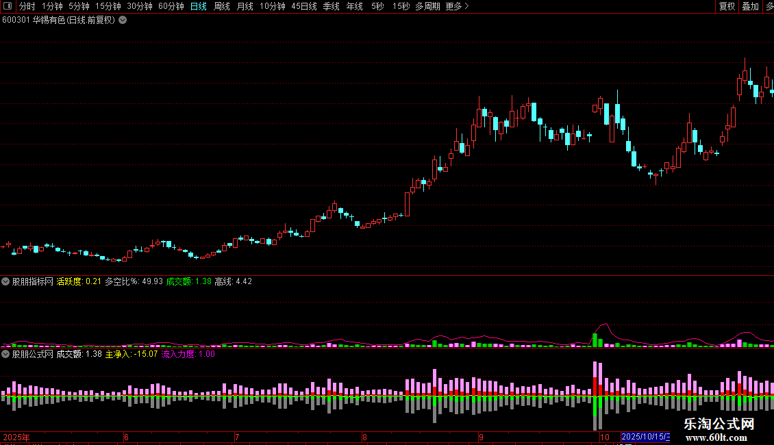 活跃度:(LARGEINTRDVOL+LARGEOUTTRDVOL)*10000/(2*FINANCE(7)),NODRAW,COLOR00FFFF;