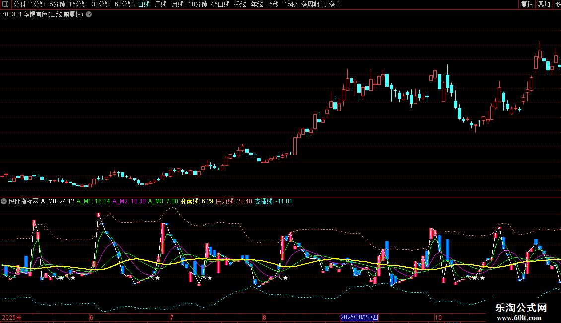 DRAWTEXT(CROSS(KML,0) AND A_M1<变盘线 AND KML<变盘线,0-0.8,'↖★'),COLORWHITE;