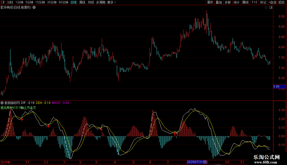 核心方法:将MACD参数放大5倍,获得类似周线MACD的数据形态,再结合原版MACD寻找买卖点。根据策略逻辑,当放大5倍周期的MACD双线上穿0轴后进行颜色标记,该模型理论强调周线DIF和DEA同步位于0轴上方,代表近期走势强势。买卖信号则依据日线MACD的水上金叉。