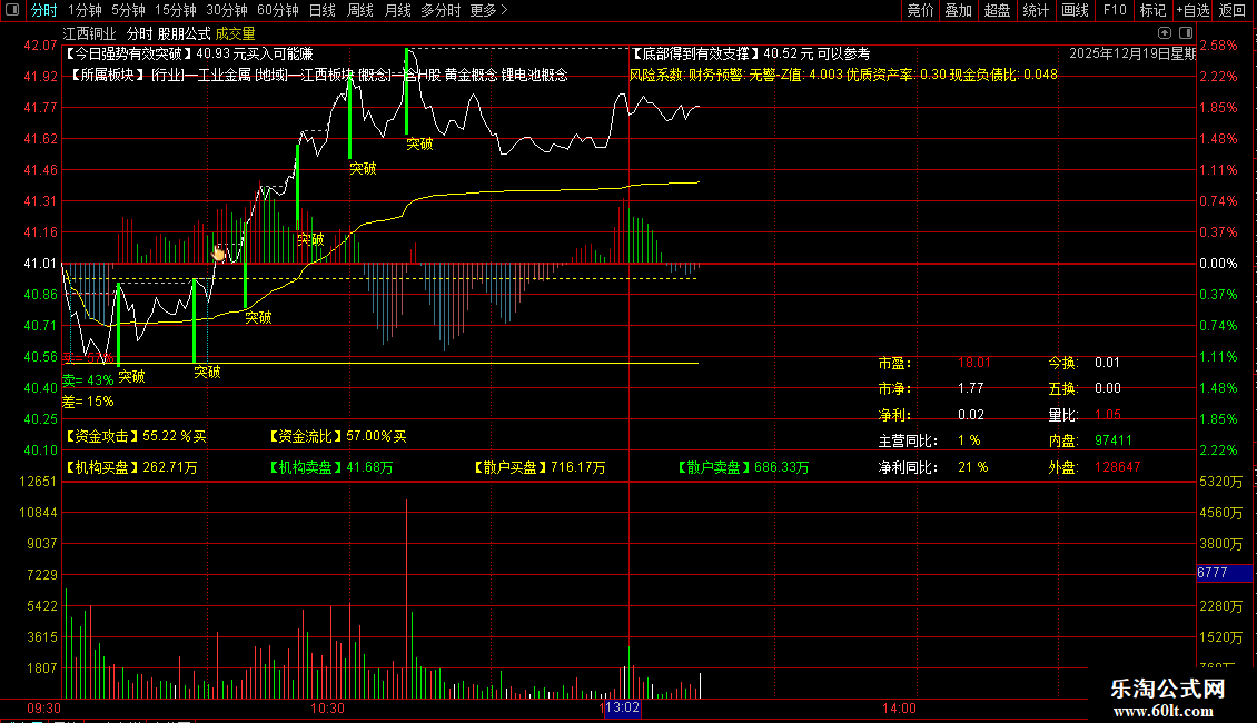 本“分时突破”指标聚焦日内交易,融合资金流、量价关系、MACD及财务数据等多维度信息,核心追踪资金攻击力度、机构/散户买卖盘占比,同时标定分时突破位、支撑位,还嵌入财务预警、估值数据等关键信息,全方位判断个股日内强弱与突破机会,帮助投资者精准识别拉升、冲涨停信号。