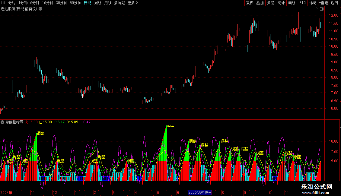 DRAWTEXT(REF(火,3)>0 AND REF(火,2)>0 AND REF(火,1)>0 AND 火=0 AND REF(火,1)>山,REF(火,1),'调整'),COLORYELLOW , ;