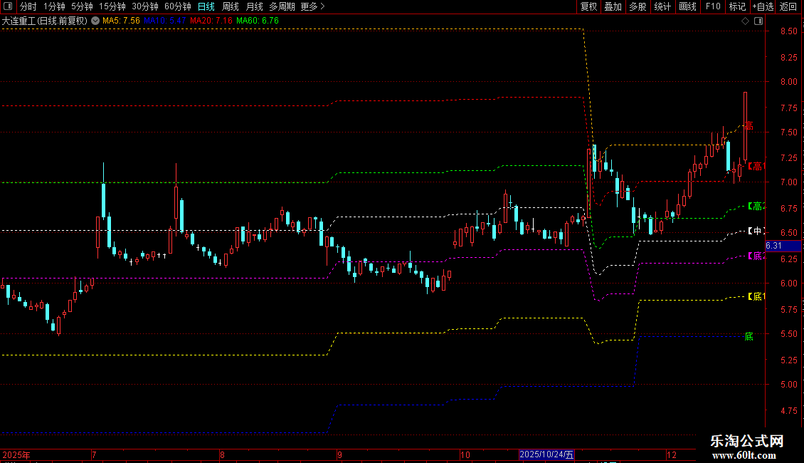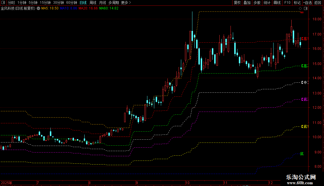 指标主要功能是绘制近期价格区间的高低点,并在此基础上划分多个关键支撑与阻力位,采用常见的黄金分割比例进行水平线标记。这些分位线有助于观察价格在回调或反弹过程中可能遇到的支撑或压力位置。操作上,投资者可结合价格接近这些分位时的走势反应,辅助判断短期买卖时机或设置止盈止损点。