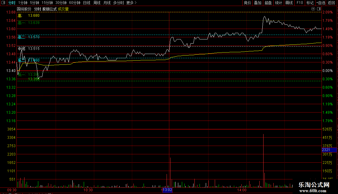 高低分割分时组主图指标是通达信软件中针对分时行情分析的实用工具,核心功能为基于当日分时走势的高低点数据,自动绘制黄金分割比例的分割线,并清晰标注 “高、中、低” 核心档位,以及 “高一、低一、高二、低二” 等细分分割位。该指标依托黄金分割的经典理论,以分时图中的当日最高价、最低价为基准,等关键黄金分割比例,自动完成画线操作,无需手动调整。画线结果直观呈现在分时主图中,“中” 位对应 0.5 分割线,是多空博弈的核心分水岭;“高一 / 高二” 向上延伸至高位分割区,“低一 / 低二” 向下覆盖低位分割区,快速识别分时行情中的支撑与压力位,为判断提供清晰的参考