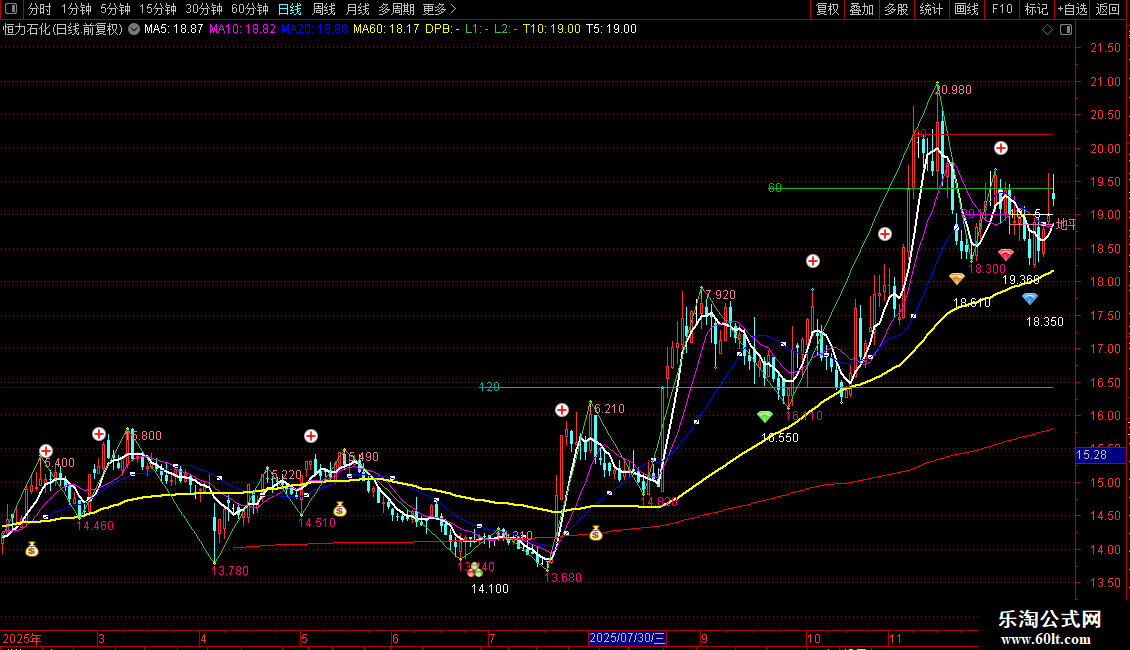 当满足条件到最后交易的周期=N60时,在T60位置书写文字,COLOR00BB00