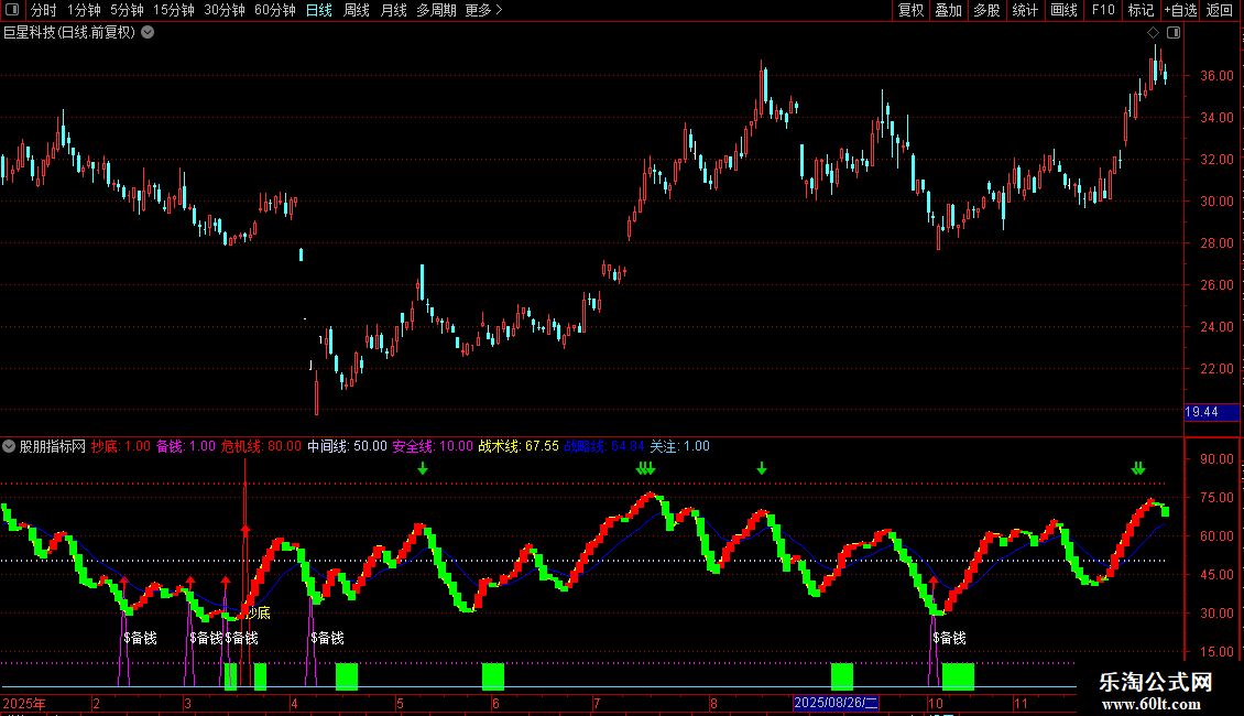 短线逃顶:=IF(I,0,1),COLORGREEN;