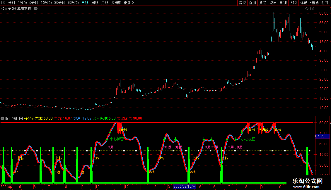 DRAWTEXT(CROSS(主力,65) AND 散户<主力,55,'冲顶 '),LINETHICK2,COLOR9933FF;