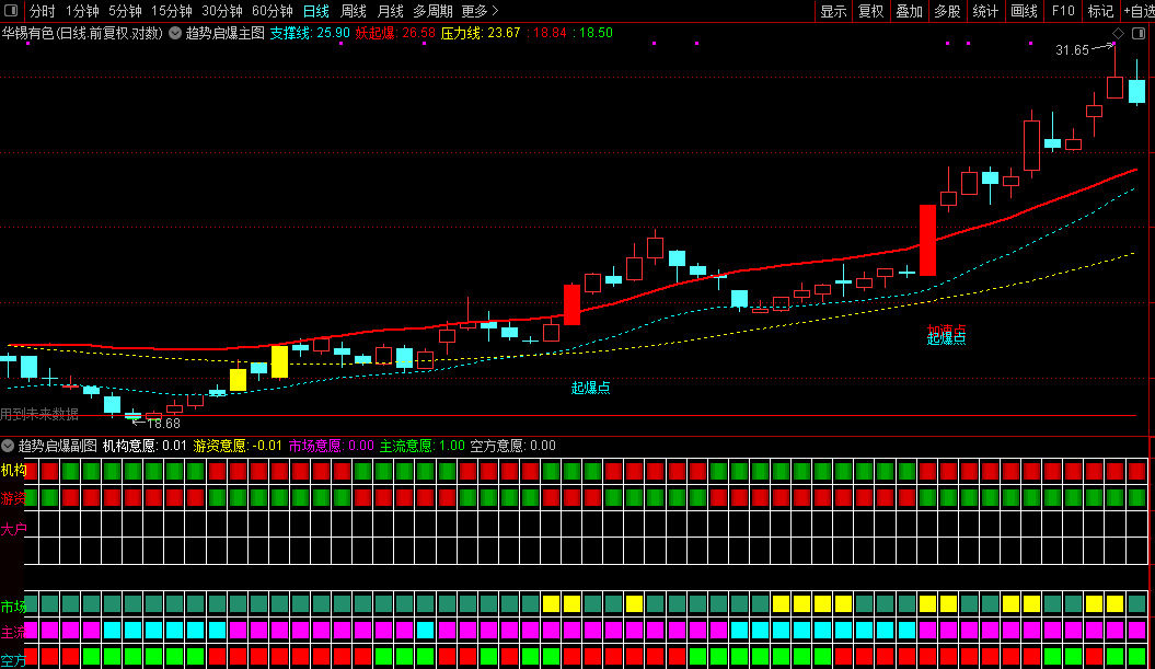 机构与游资意愿:位于图表上半区,通过红绿柱体显示大资金活跃度,同步翻红时资金合力较强。