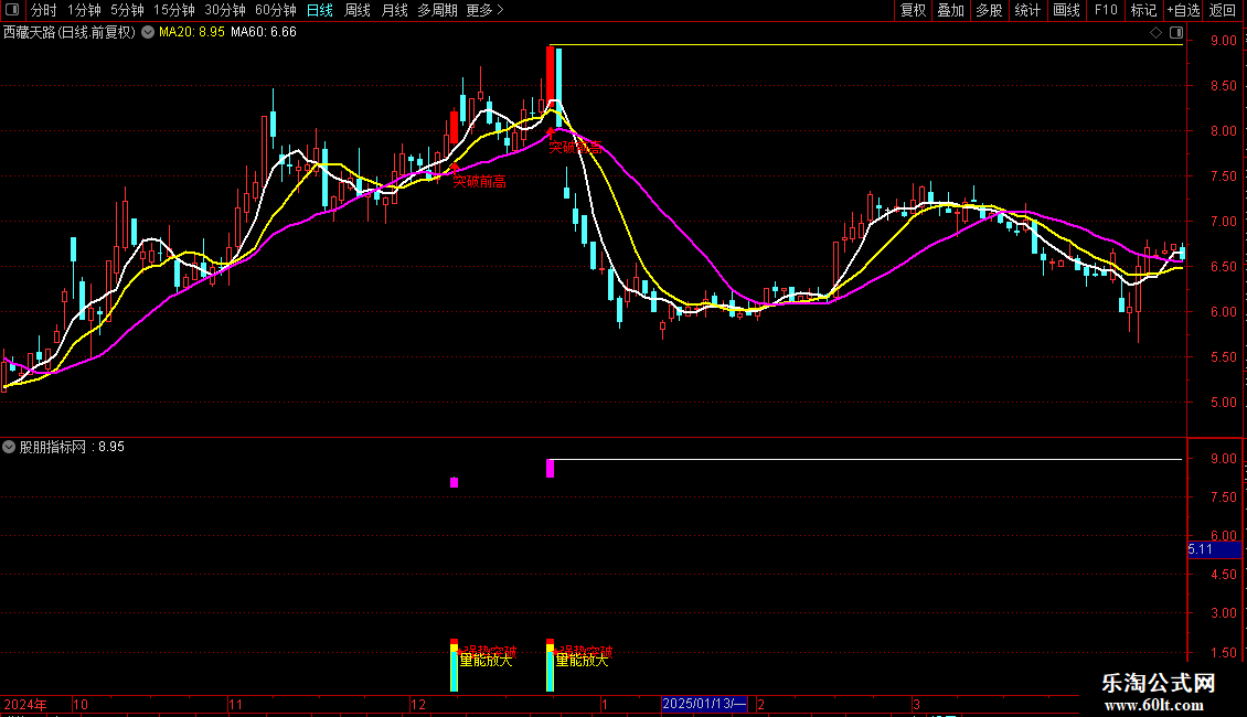 指标主要用于捕捉强势突破行情。它综合了价格突破近期高点、成交量明显放大、MACD金叉以及短期均线呈多头排列等多个条件,只有当这些信号同时出现时,才触发“强势突破”提示。操作上,投资者可在信号出现时视为潜在买入机会,尤其适用于趋势启动初期的确认。整体策略强调量价配合与技术指标共振,提高信号可靠性。
