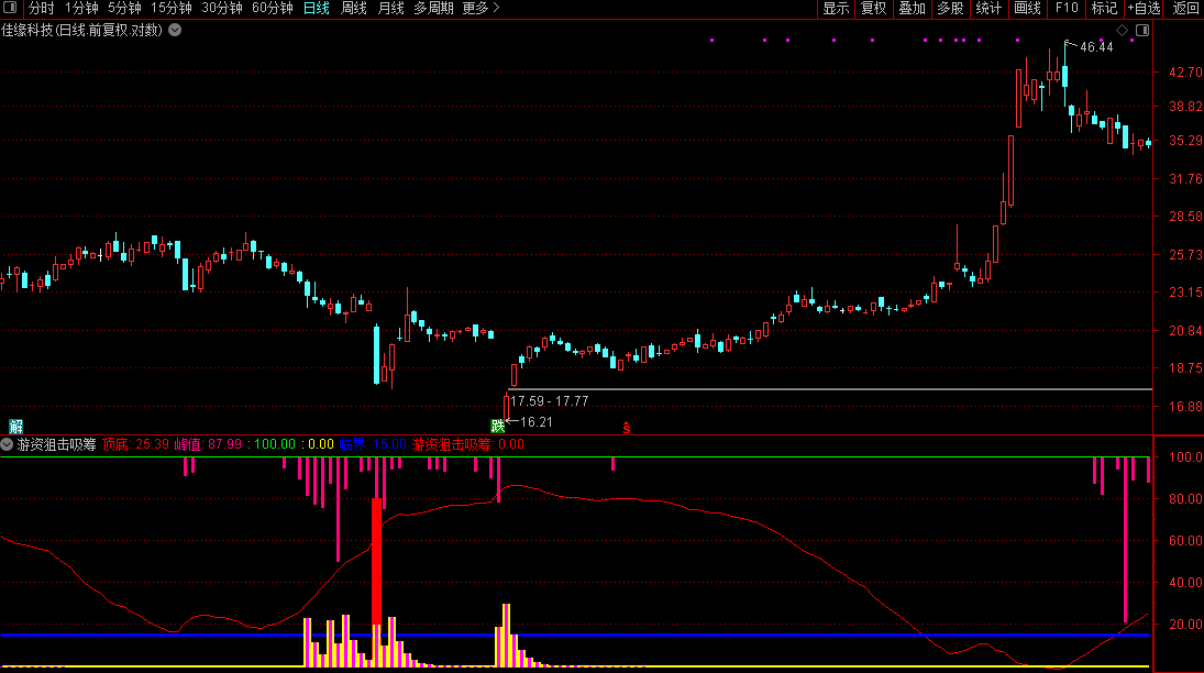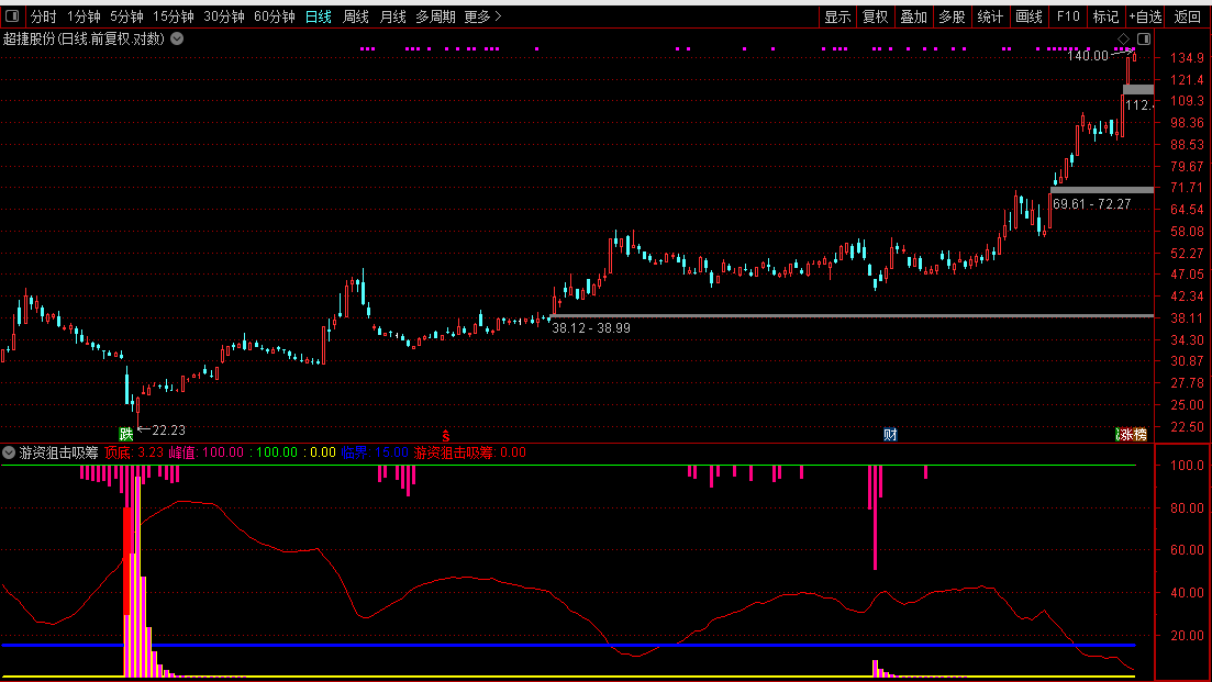 游资吸筹信号:“游资狙击吸筹” 出现明显柱体(青 / 红),柱体越高,游资低位吸筹越活跃,短线爆发性越强;