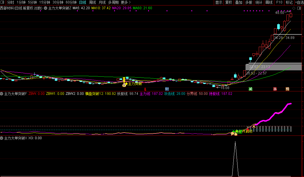 本套公式由主图、副图与选股三部分组成,专为识别主力资金强势介入、横盘蓄势后的突破行情而设计。