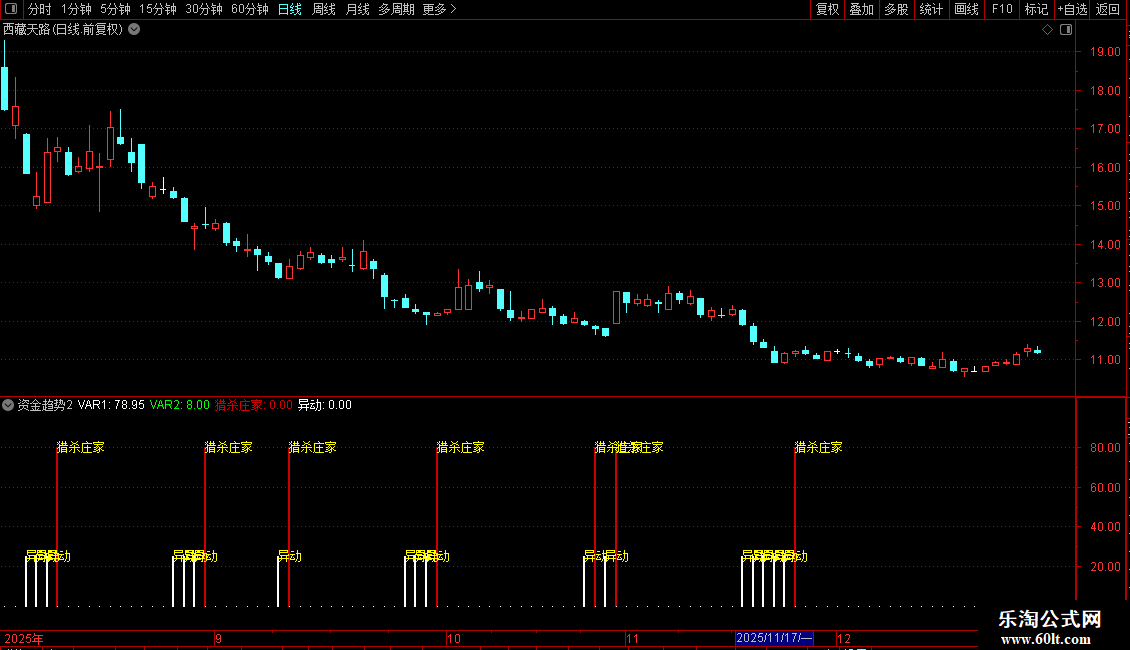 指标通过比较股价在近期高低点区间中的相对位置,构建出两条平滑曲线,用以捕捉短期价格动能的变化。当快线向上突破预设阈值时,视为强势信号,提示“猎杀庄家”;当指标回落至低位区域,则标记为“异动”,暗示市场可能出现异常波动或主力动作。整体策略偏向短线交易,适用于震荡或启动初期的行情识别。