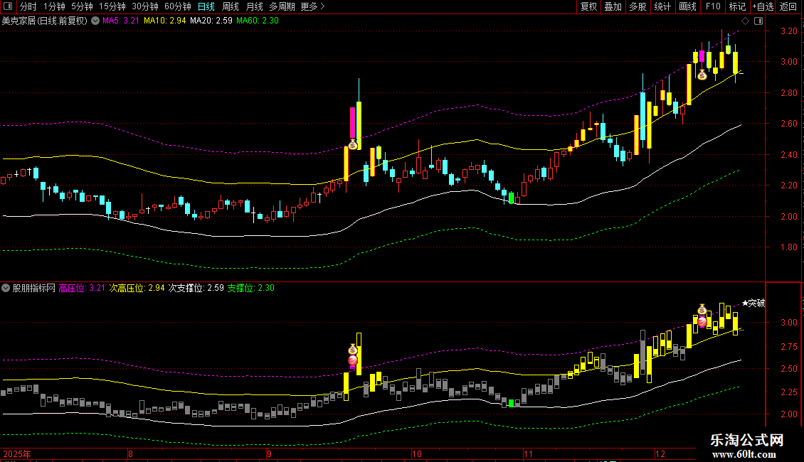 2.指标依据趋势强度级别进行判断。当趋势强度达到4级时,会在高位触发洋红色柱子,且首次出现4级强度时叠加“钱袋子”标志,此为核心的中线趋势启动信号。