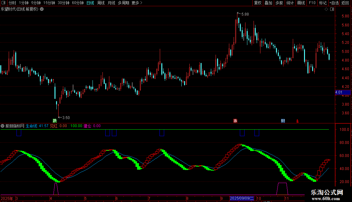 IF(VARC<79,100,IF(CROSS(VARD,VARC) AND VARD>79 AND VARC>79,70,100)),COLOR00FF00;{灯塔脉冲}