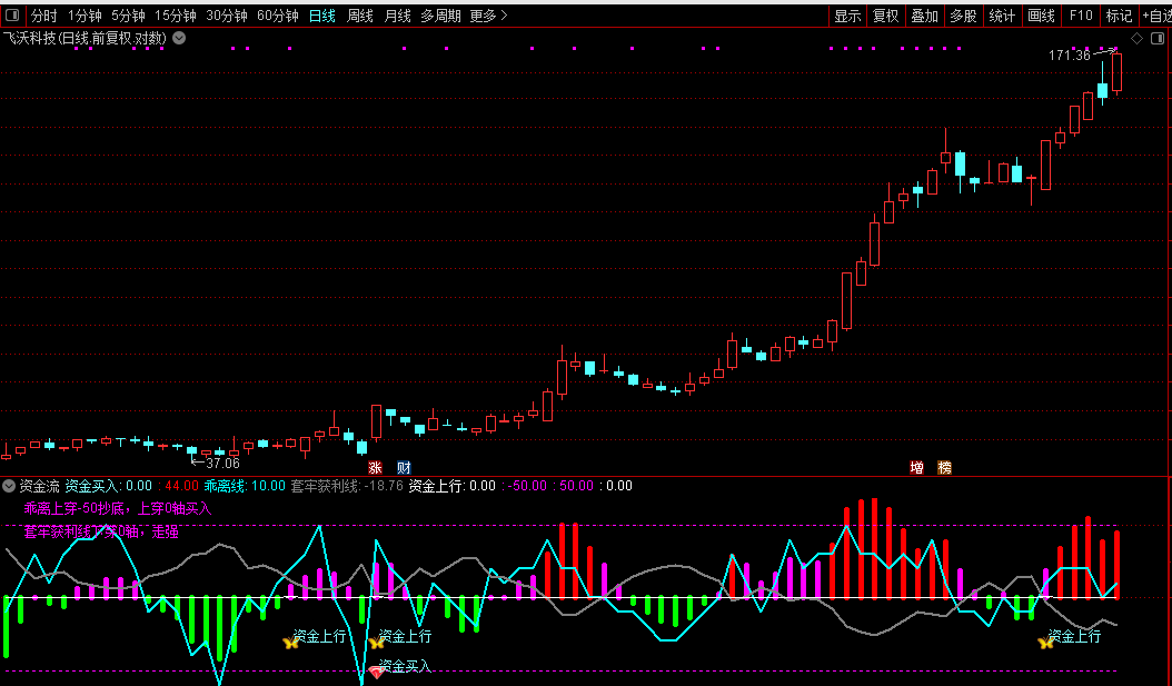 原资金流指标虽然有一定的实战作用,但是可能要表达的东西过多,导致线条零乱,看的人眼花缭乱。于是删繁就简,取其关联度较高的几个线条,其中的流金流用竖条表示,看起来要觉得比原来的方便多了。再加了二个选股信号,但是选股信号的通病都一样:准确度一般。但是可以在自己的自选股和热门股作为参考。