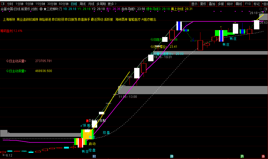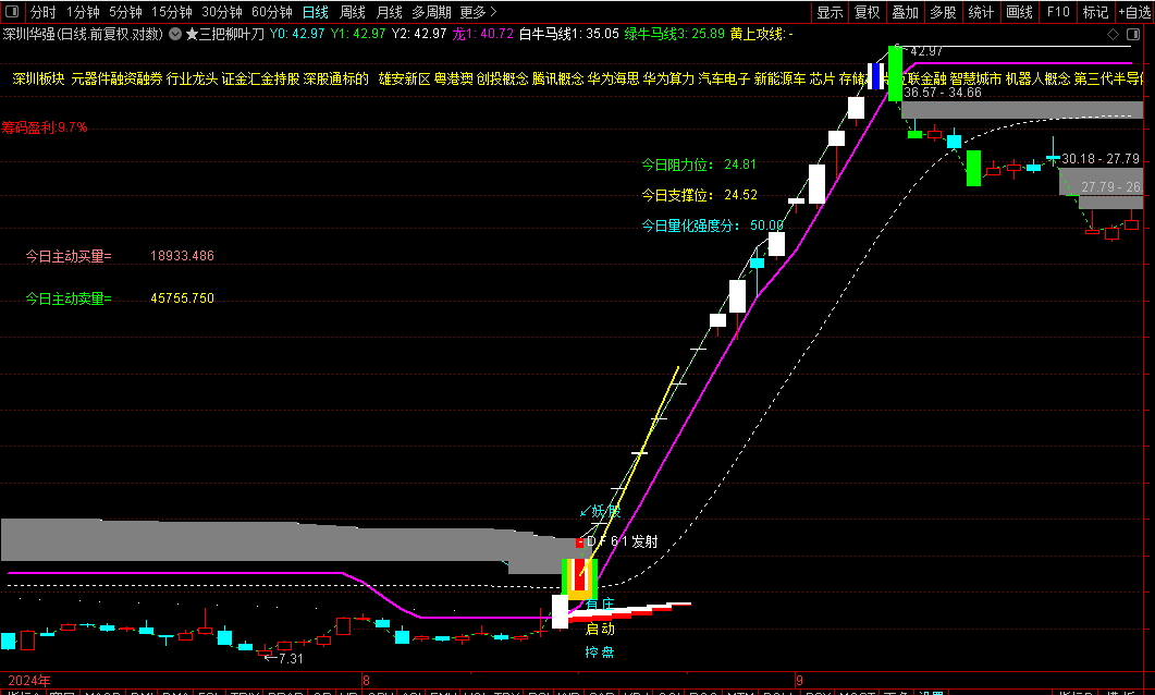 2024年8月16日: K线站上游资情绪线(白虚牛马线)并受到白红柳叶刀的均线托底支撑,说明股价在均线上方附近开始站稳走强。同时股价左侧的最大牛股急升线}Y0线(灰色柳叶刀),也是比游资情绪线(白虚牛马线)位置更高的拉升阻力线。 要点:1、灰色柳叶刀消失。2、同时下方也受到三把柳叶刀的均线支撑。3、彩色共振K线出现,波段拐点来临。