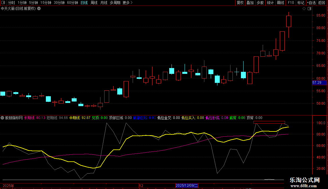 顶部区域:(中期线<REF(中期线,1) AND REF(中期线,1)>80) AND (REF(短期线,1)>95 OR REF(短期线,2)>95 ) AND 长期线>60 AND 短期线<83.5