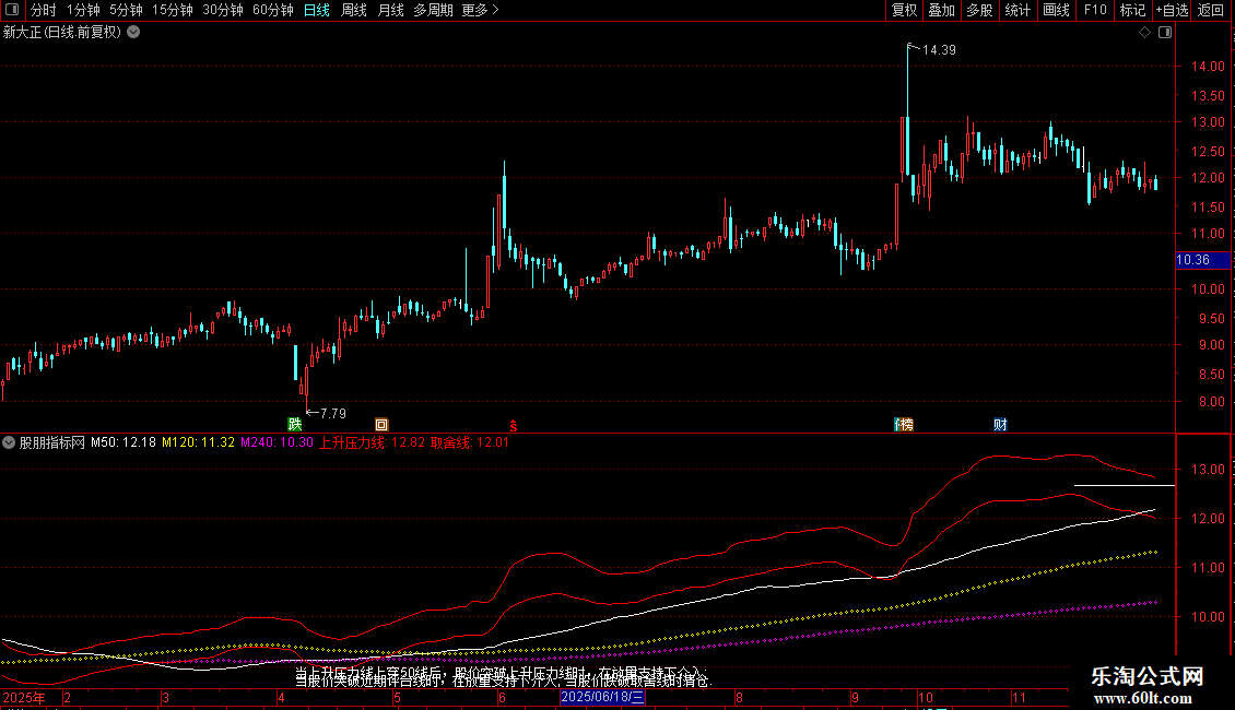DRAWTEXT_FIX(1,0.25,0.9,0,'当上升压力线上穿50线后,股价突破上升压力线时,在放量支持下介入;');