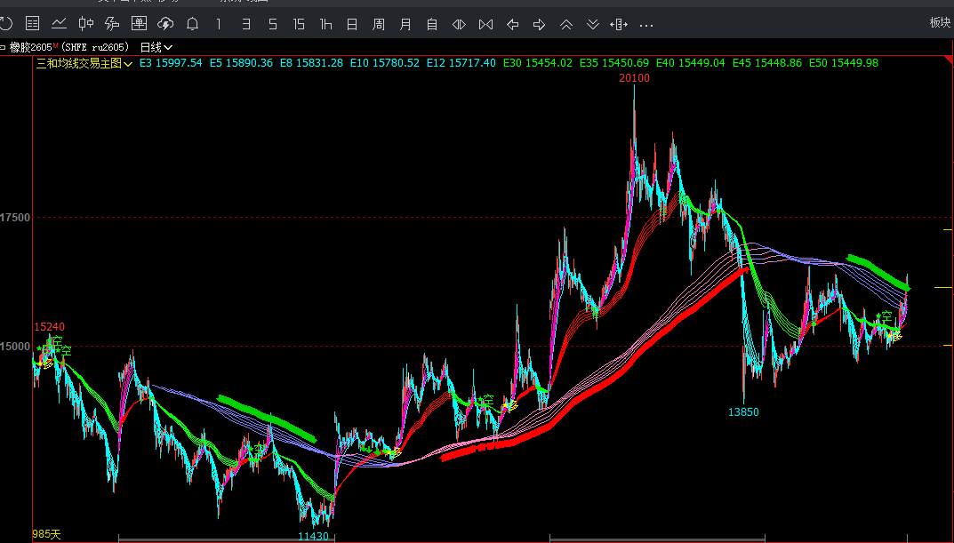“三和均线交易主图”是一款融合短、中、长期多组均线的智能交易系统,通过三重周期(5–15日、60–80日、230–270日)EMA与MA均线组合,构建出高灵敏度的趋势识别框架。公式以青色、绿色、蓝色分别标识不同周期均线,并用洋红/红色高亮连续3日上涨的均线,直观反映各周期动能方向。
