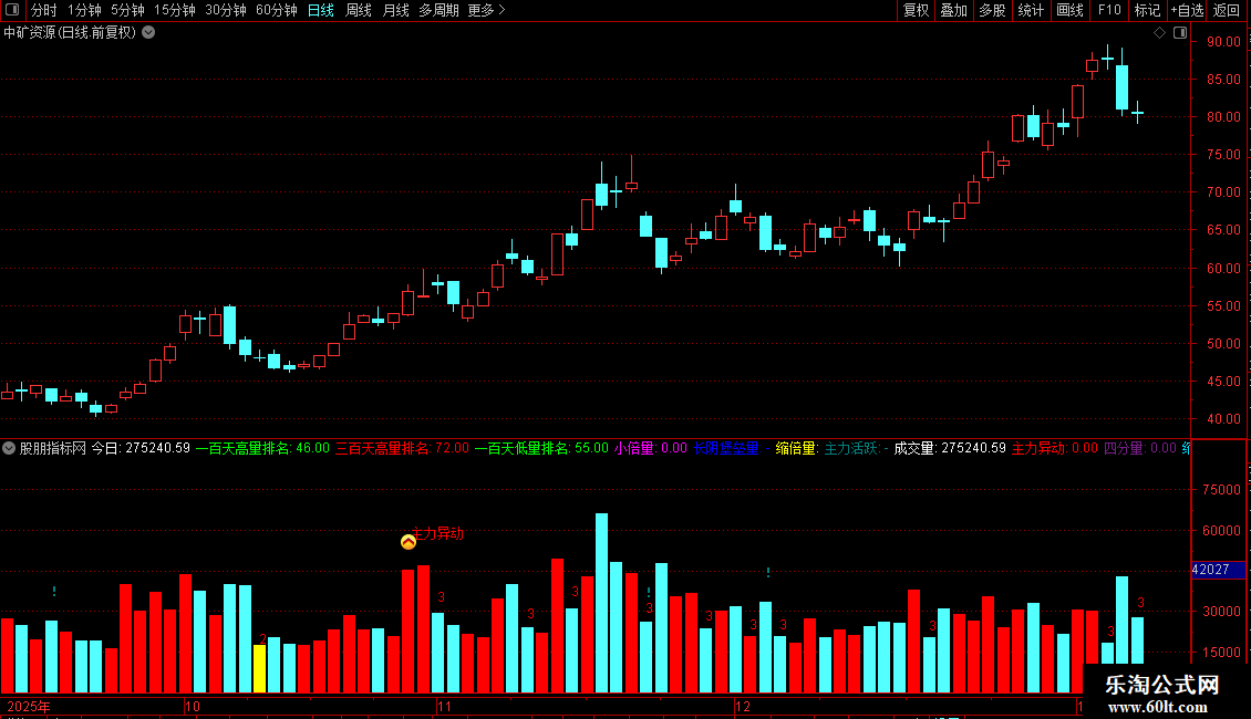 【主力思维量能】绝密买点指标是一款基于成交量分析的专业工具,通过识别多种特殊量能形态来捕捉主力资金动向。该指标核心逻辑在于:量是价的先行指标,通过分析"小倍量"、"缩倍量"、"百日低量"、"四分量"等特殊量价形态,结合"主力异动"信号(V5上穿V35且放量),精准识别主力建仓和启动点。