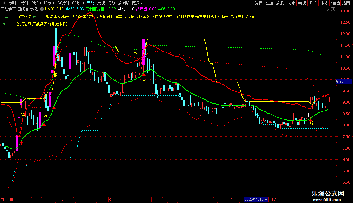 当图表出现黄色"爆"字图标时,意味着股价同时突破技术箱体与筹码压力,伴随成交量放大,是强烈的启动信号。此时结合中轨(绿色均线)趋势向上,可积极关注。若出现"突"字标记,则提示股价突破历史密集筹码区,后市空间打开。
