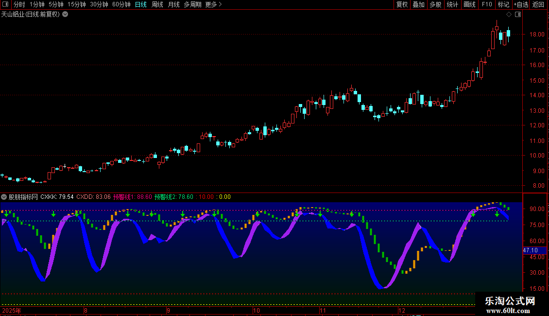 本策略依托CX1(红色)与CX2(黄色)指标线跟踪股价运行趋势,结合KD漂带指标(CXKK与CXDD线)清晰标识强弱区间,并设置0、10、78.6、88.6四条关键预警线。该系统提供明确的与交易信号:当CXKK线上穿10且其差值不超过1时,发出买入信号;持仓线超过88.6时,提示卖出预警。CXD1动能柱以红色上涨、绿色下跌直观反映动力强弱,适用于震荡行情中捕捉短线机会,也可用于筛选具备强势突破潜力的个股。