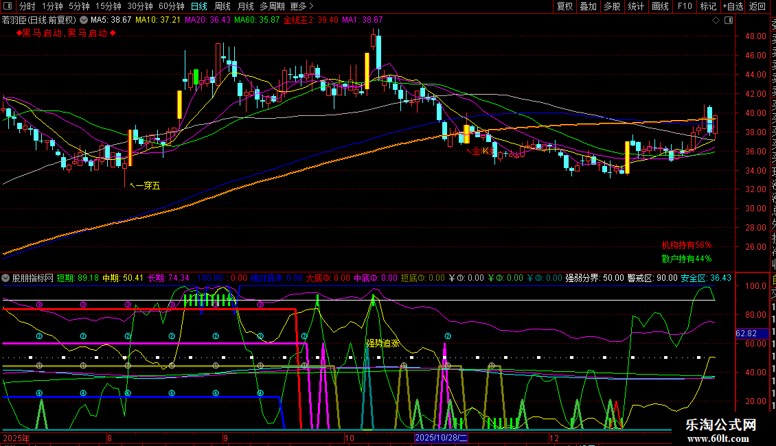 DRAWTEXT(金K线 AND VARR6 AND VASS3,L*0.94,'↖黑马启动'),COLORRED;
